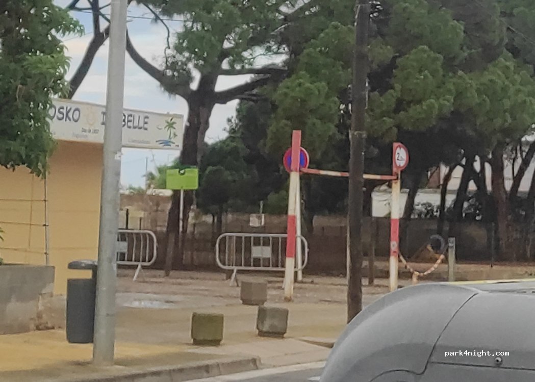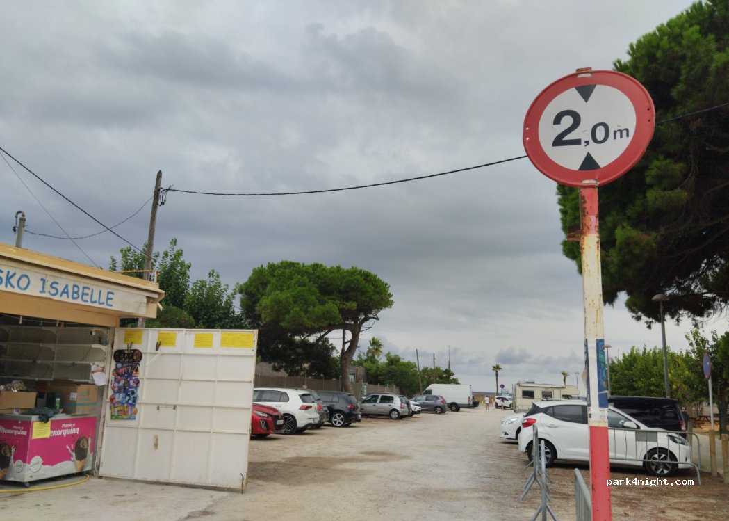 Free parking on the beach. At the entrance there is a height limit bar of 2 meters, and a sign that allows parking all week.