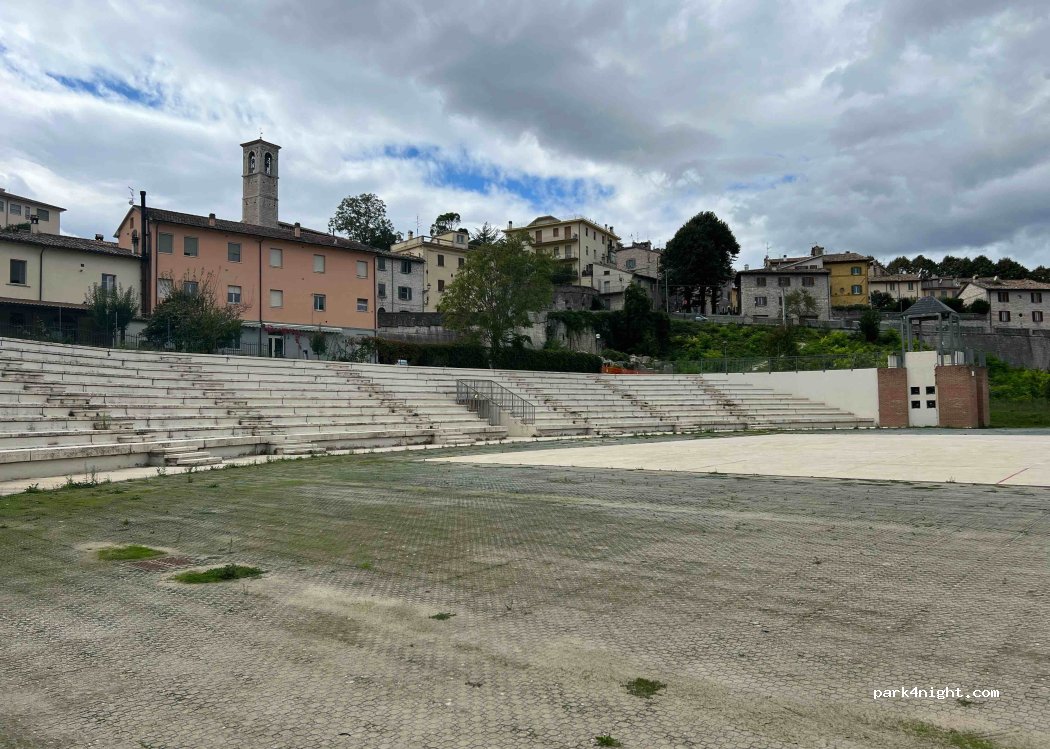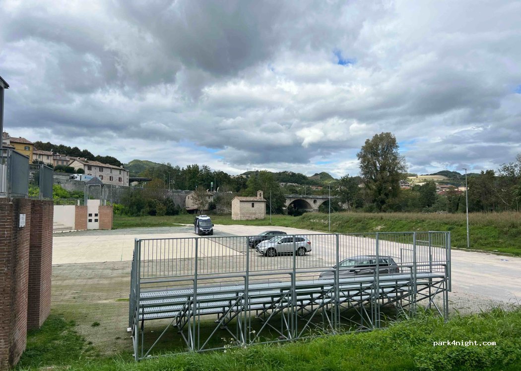 Grande parcheggio praticamente deserto, molto tranquillo, ma anche molto soleggiato, sconsigliato in estate. Da non perdere a poca distanza il ponte romano della vecchia via Flaminia che si trova sotto il nuovo ponte, la piazzetta e la rocca della città, con singolare forma ovale.