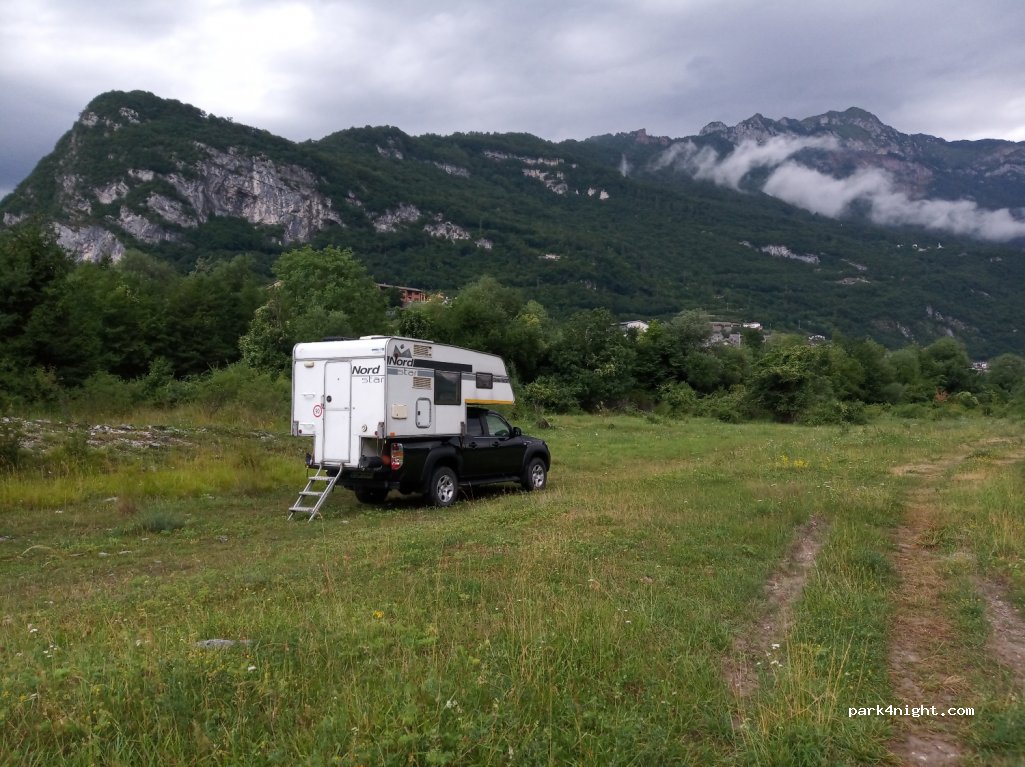 Realmente es una esplanada enorme (No solo 2 sitios como pone arriba) con césped al lado del río. hay una entrada corta (50metros ) de terreno de grava apta para todo tipo de autocaravanas. nosotros 6 metros. pero ha llegado hace un momento un camión.