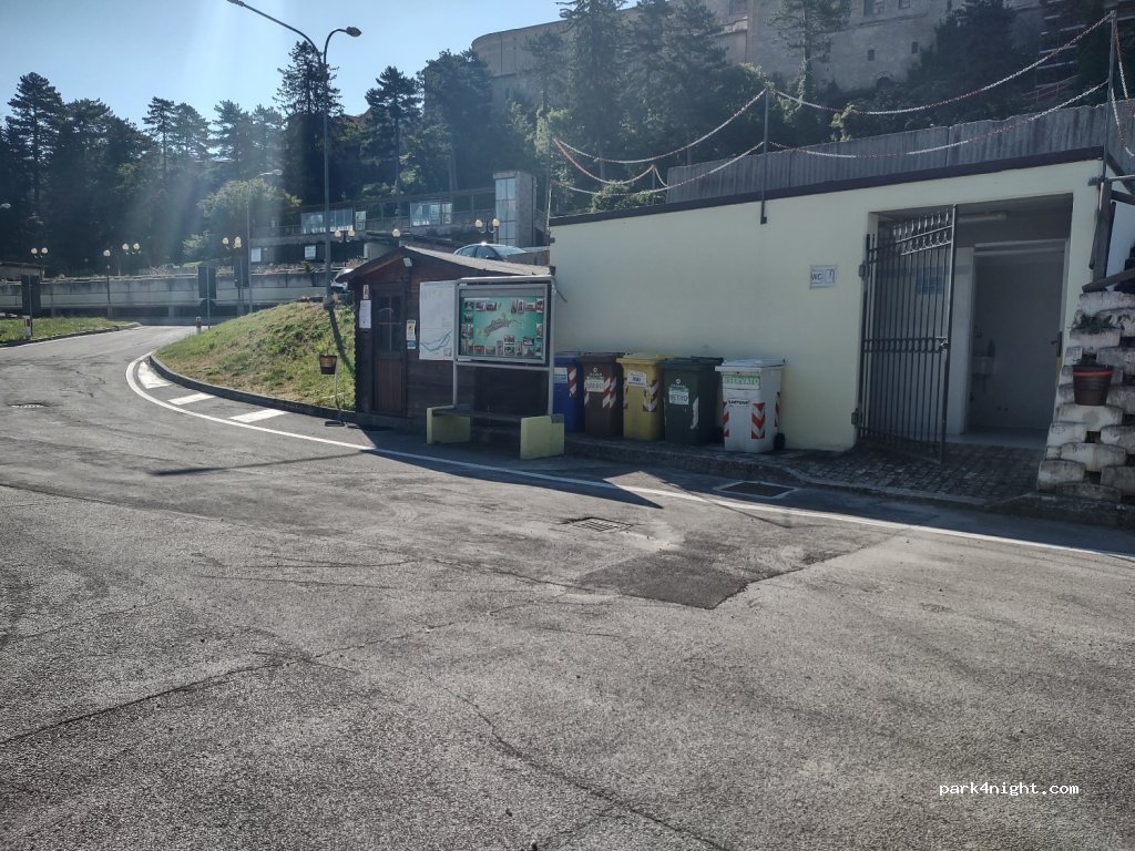 Ottima area gratuita con leggerissima pendenza. Diverse colonnine di acqua ed elettricità vicino alle piazzole. Due bagni con doccia e acqua calda. Carico con pistola e tubo allungabile e scarico molto comodi. Purtroppo dopo il terremoto la città è tutto un cantiere e i sistemi autonomi di salita al centro sono chiusi. Per entrare basta aprire manualmente la sbarra, lo stesso per uscire.