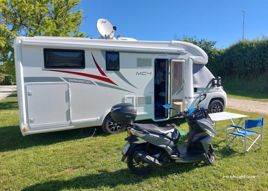 Parcheggio camper discreto, piazzole su prato e possibilita di aprire tendalino. Prezzo 23 euro camper e due persone, accettano cani e c'è anche la spiaggia libera dog friendly. Il parcheggio è situato sotto a una strada ad alto scorrimento per cui avevamo la strada sulla mansarda. sconsigliato per chi vuole passare una notte tranquilla