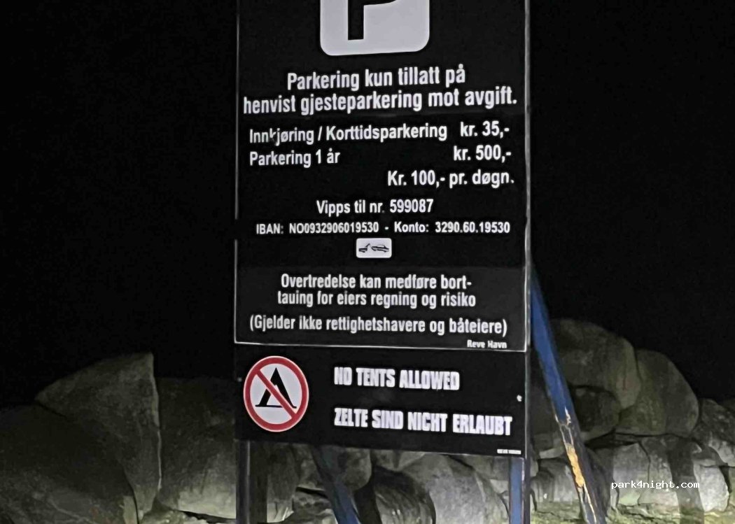 Direttamente sul mare, a fianco di un piccolo porto privato. Tranquillo, silenzioso e con una vista mozzafiato. Non è gratuito ma, considerando la posizione e il fatto che in zona i parcheggi sono tutti vietati alla sosta tra le 24 e le 5, i 100 NOK richiesti sono davvero nulla.