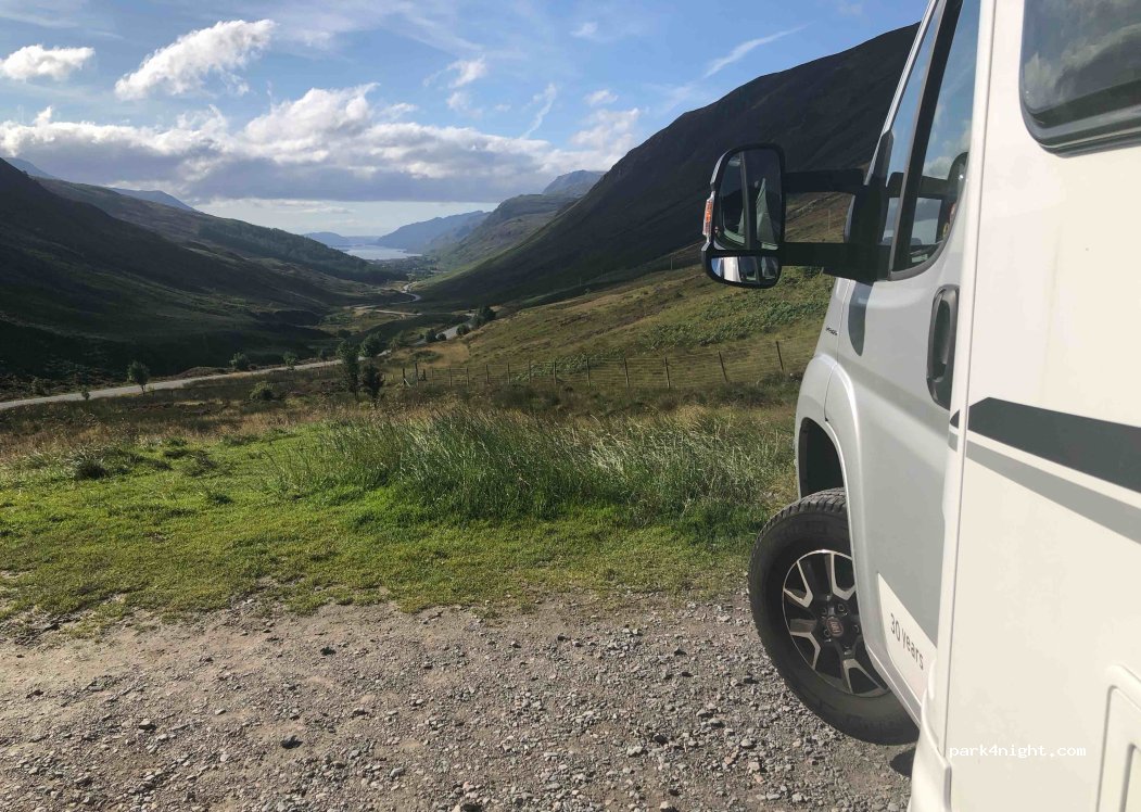 The most beautiful view!!! Probably very exposed in high winds (if it's windy I would continue towards the loch and park in lay by down the hill on right, much less pretty but more sheltered). So peaceful, sat outside of the van you can hear birds, a little stream, wind and that's it! It is right on the road but very little traffic. One other van here when we were.