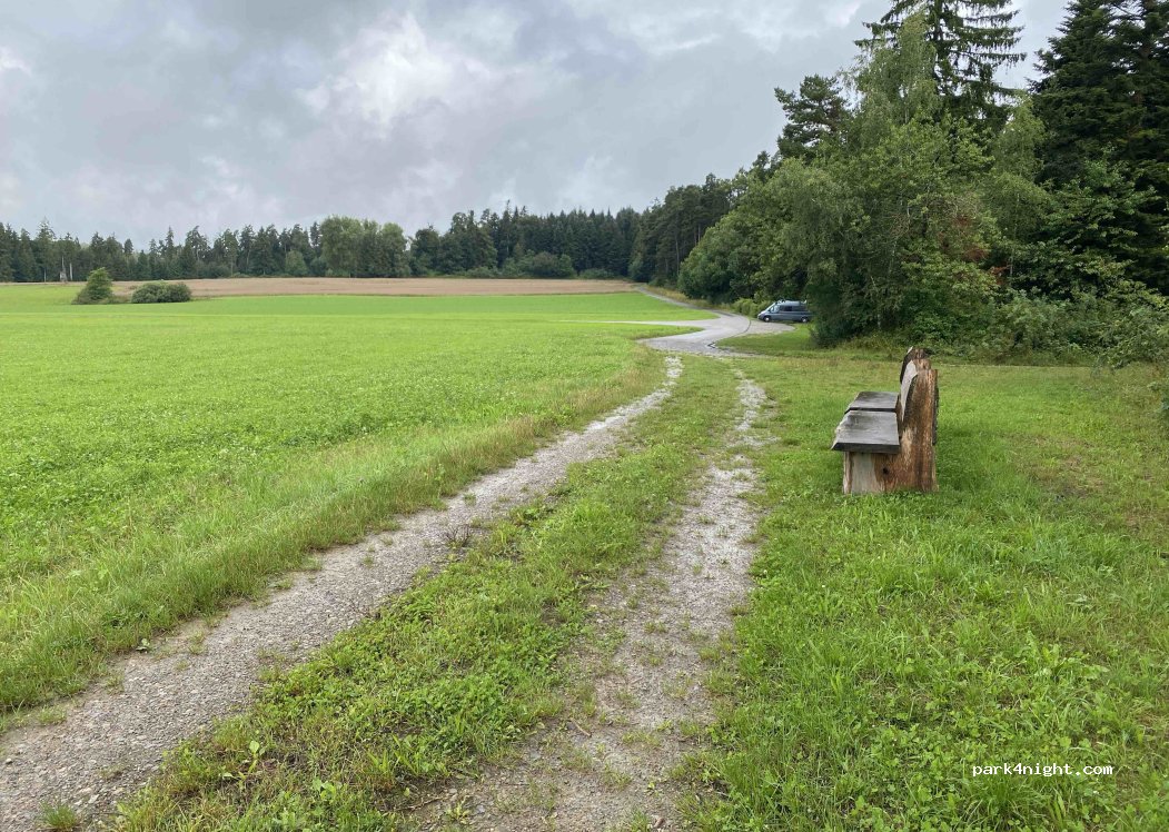 Small gravel parking lot, approx. 5 parking spaces, next to it a picnic area with 2 tables / benches (also covered) and a barbecue area. Right between fields, meadows and forest. Very quiet, quite aloof.