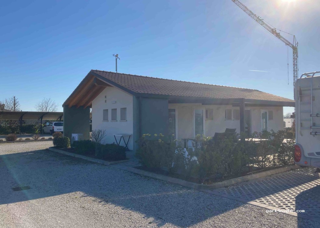Stellplatz eingezäunt, beleuchtet und mit Kameras überwacht. Sehr netter Platzwart. Frühstück möglich. Sanitäre Anlagen in perfekter Ausstattung und Zustand. Grauwasserentsorgung, WC Entsorgung und Frischwassertanken vorbildlich. Absolut ebenes Gelände. Fussläufig ist eine absolut spitzenmässige Pizzeria in 30 Minuten zu erreichen. „Pizzeria da Valter“. 8Meter WoMo kein Problem.