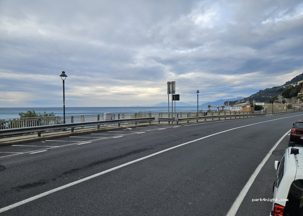 Abbiamo sostato 1 notte e mezza giornata, la notte passata un po in pendenza e un po disturbata x il passare delle auto vicine al mezzo. comodo per raggiungere la spiaggia. poco piu avanti direzione Ventimiglia ci sono dei parcheggi un po piu a lato e quindi pou sicuri e meno disturbati dalla gente che passa a folle velocità.
