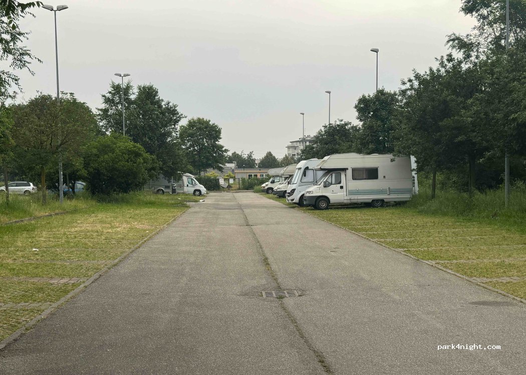 Free car park. Plenty of room for my 7.3m MH, no services, petrol station two min walk away. The feeling of the car park is strange as there’s older MH’s here which look they never move. Bit like a MH graveyard. Strange. We slept the night and visited Milan on bikes with no issues. Quiet area and a good stop over. I would return.