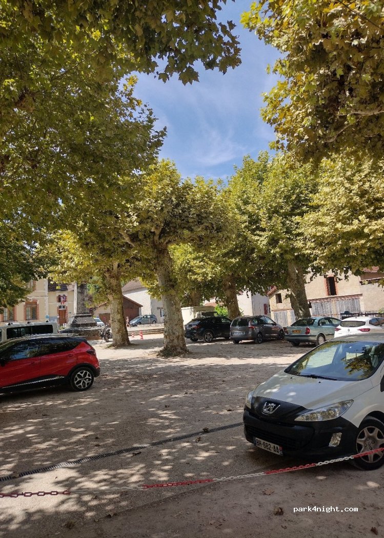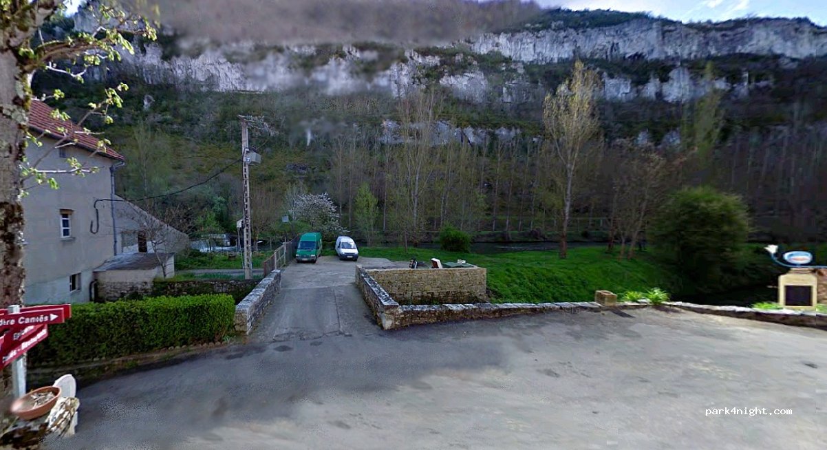 Bercement du barrage / moulin. proximité très bonne boulangerie et abbaye. 1 place en bord du lot. Sanitaires à 200m par le bord de Célé. Au pied des falaises - top !