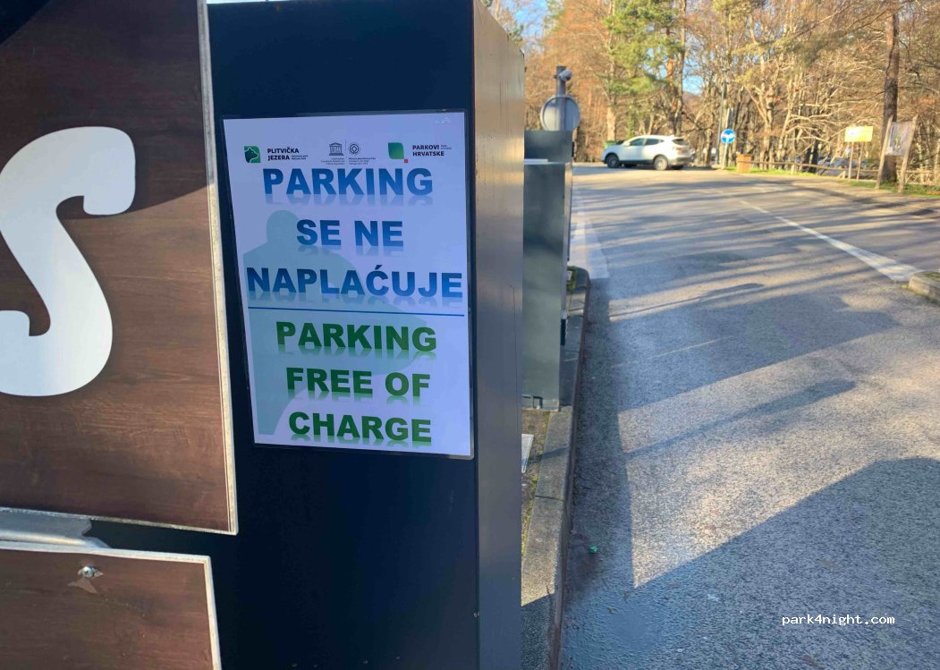 Parking cher, même en basse saison : 80kn pour la journée, le 02/11/2021. Parking jour uniquement. Toilettes à proximité. Nous sommes pique-niqué dans le parc des lacs de Plitvice.