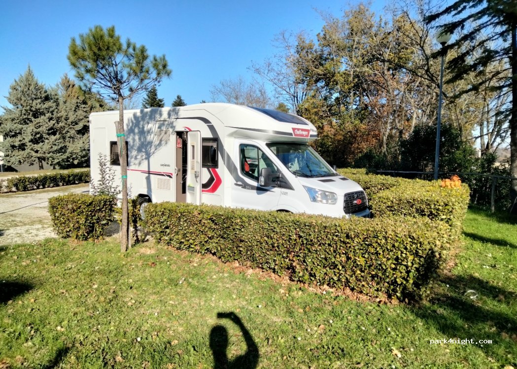 Area sosta gratuita in piano su ciottoli, carico e scarico gratuito, zona tranquilla nel verde illuminata, tavoli da picnic e spazzatura, 1km circa a piedi per arrivare al centro storico di Petritoli