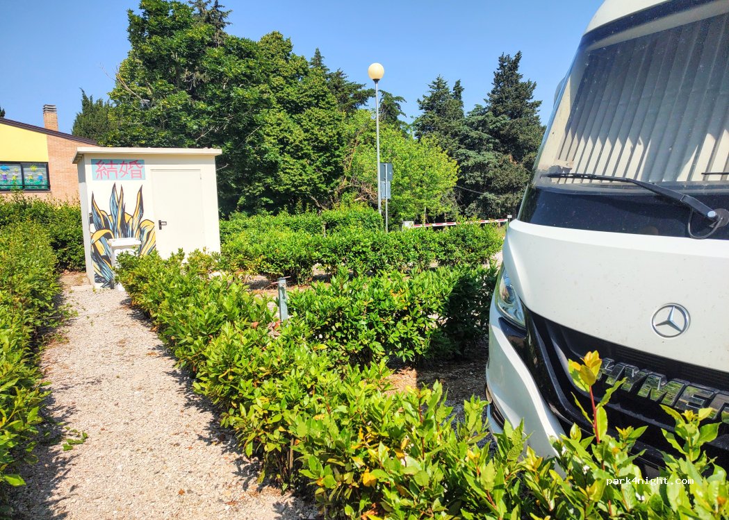 Parking plat gratuit sur galets, chargement et déchargement gratuits, quartier calme dans la verdure illuminé, tables de pique-nique et poubelles, environ 1km à pied pour se rendre au centre historique de Petritoli
