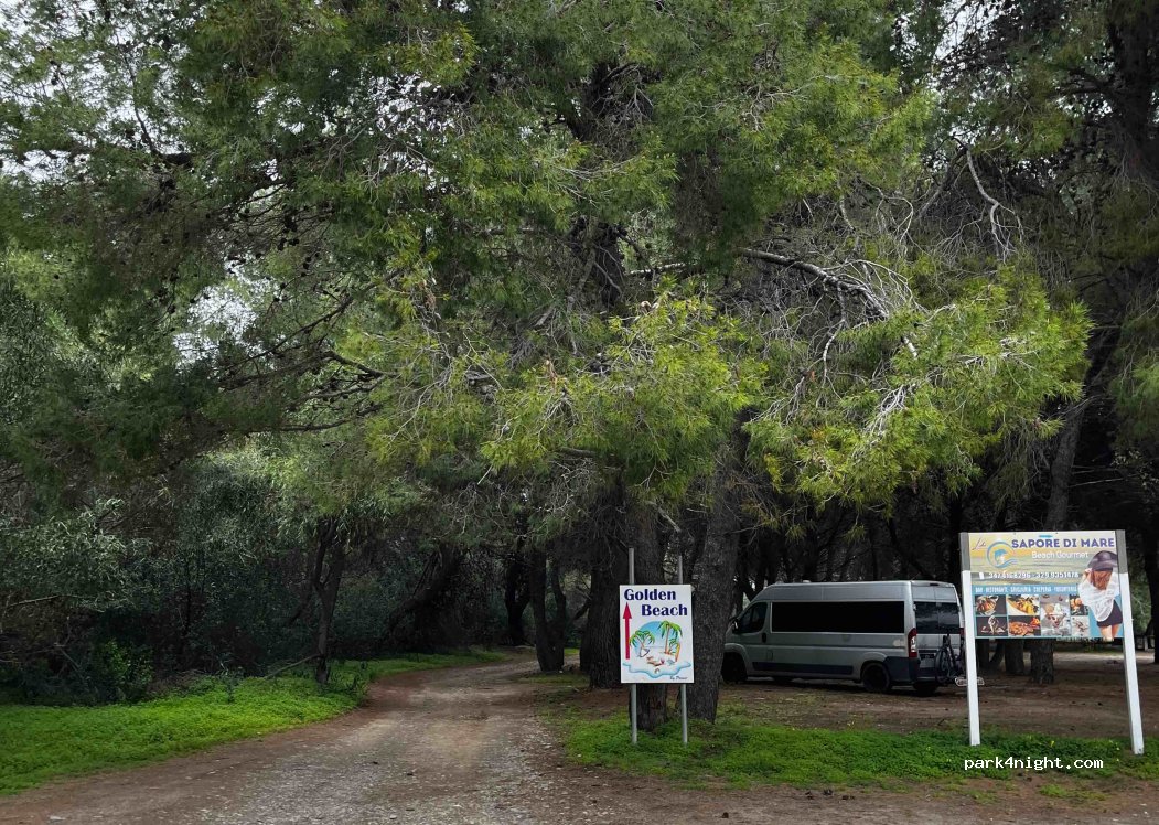 ho passato una notte a inizio luglio nel parcheggio del lido Golden beach, ho chiesto ai proprietari che mi hanno confermato che in settimana non ci sono assolutamente problemi a passare la notte qui ho dormito benissimo, posto ombreggiato e in piano connessione internet non ottimale per lavorare(Tim) ma comunque fattibile per chi non ha grandi esigenze