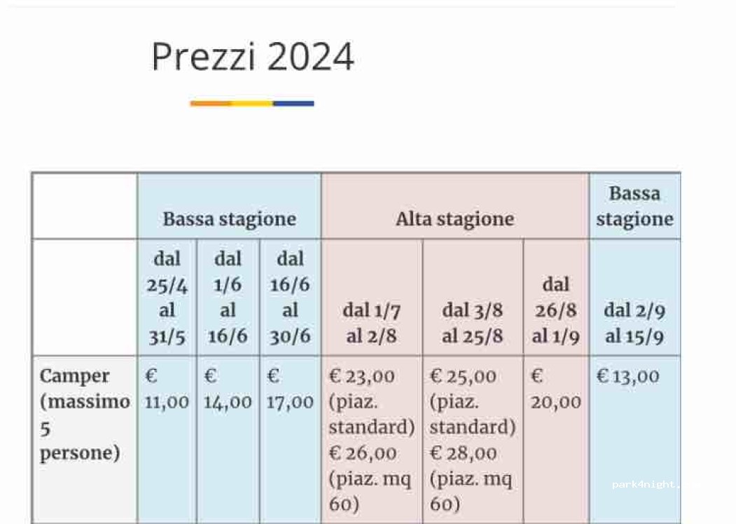 Ad aprile 11 euro elettricità inclusa. Non manca niente, ci sono anche giochi per bambini e un tendone con tavolini, giochi in scatola e TV. Si raggiunge la spiaggia attraverso un sottopassaggio direttamente dall'area sosta. Più accogliente di certi campeggi, pulito, ottima attenzione alla raccolta differenziata.