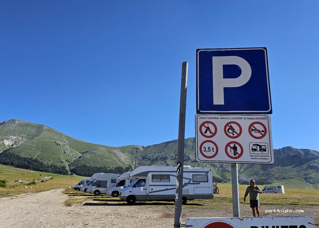 Un grand parking à côté d'une boucherie avec un espace barbecue, au milieu d'un paysage tibétain du plateau. Des températures agréables même en été. Achetez votre propre viande (dont les fameux arrosticini) et faites-la griller vous-même. Un peu d'animation italienne le week-end, et une nuit merveilleusement calme pour les nuits d'étape (maximum 2 nuits autorisées). Une source à proximité. Des chevaux sauvages. Ce lieu authentique vaut vraiment le détour.