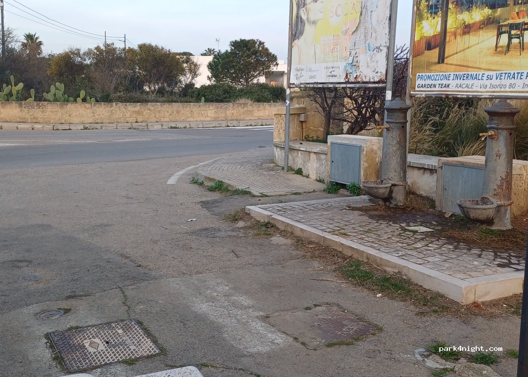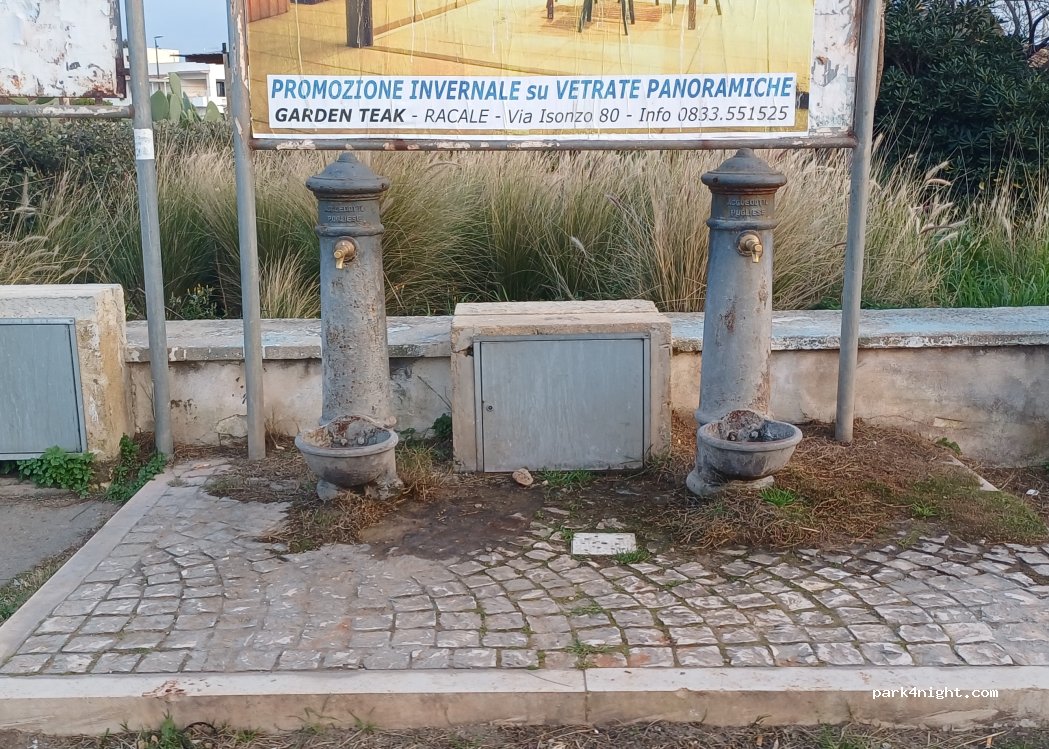 Ci sono due fontane con il getto molto potente, ci vuole il riduttore con la gomma morbida per agganciare il proprio tubo per fare il pieno di acqua, altrimenti con la tanica. C’è il posto comodo per fermarsi.