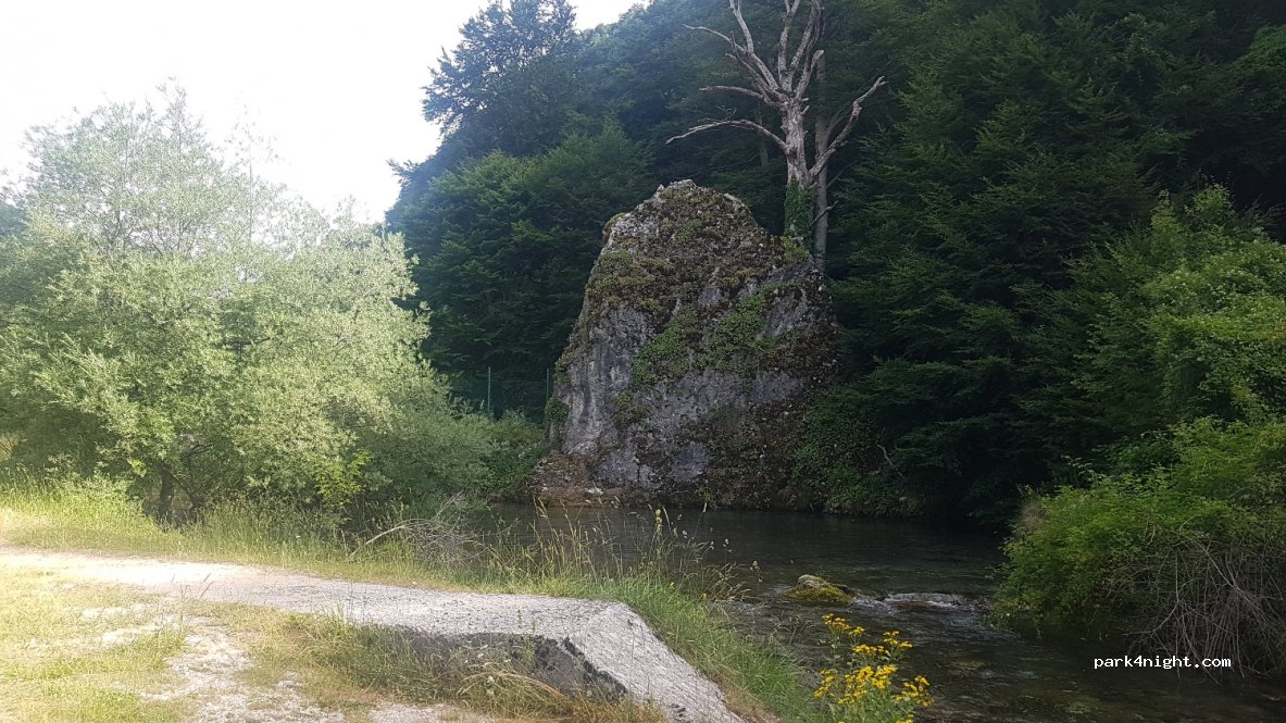 vasta area parcheggio con fontanelle e barbecue ,sia solo parcheggio libera oppure area carico /scarico con lavatoio docce/corrente/tendalini. punto di partenza per diversi percorsi naturalistici,a circa 2 km c'e' cascata naturale benedetta da papà Giovanni(effige votiva). un ruscello di acqua gelida passa la valle