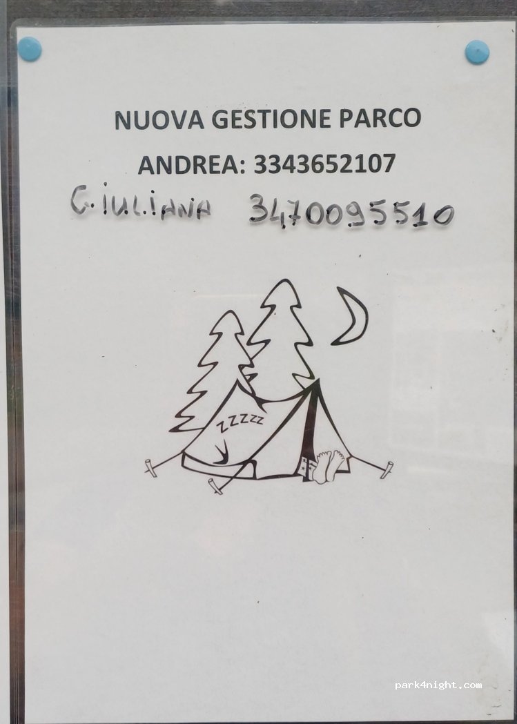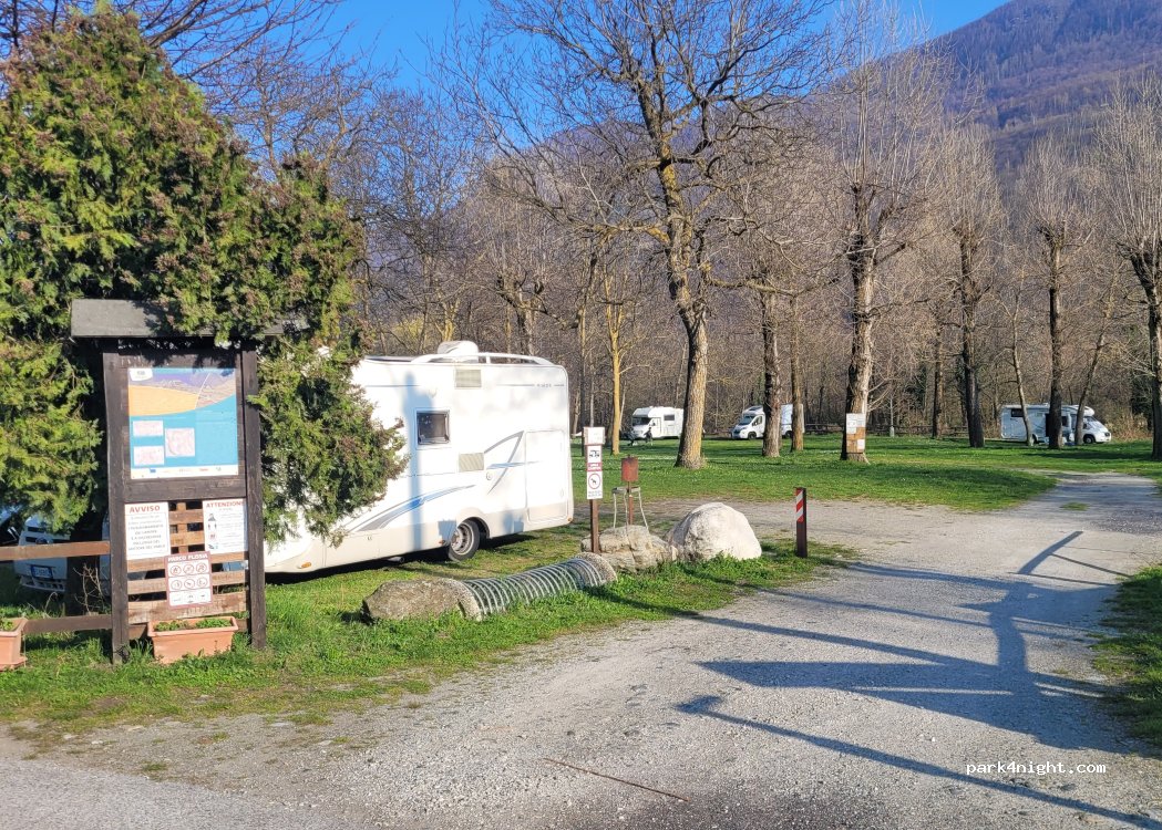 Sosta su prato ombreggiato da piante di noce con ampia chioma. Zona molto tranquilla in piano. La struttura offre carico, scarico e svuotamento cassetta wc. Lavandino per lavare le stoviglie. Bagno unico. A breve bagno per diversamente abili e due docce. Negozi, ristoranti e pizzerie, raggiungibili a piedi in 10 minuti.