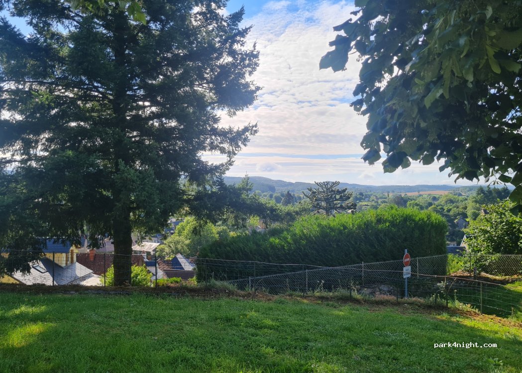 Parking plat avec de la verdure, calme ( a côté d’une église donc sons des cloche) grande monter avant d’arriver au parking, après de belle balades en forêt ( cascades, escalade, grotte dés fée…) boulangerie à 10min à pied