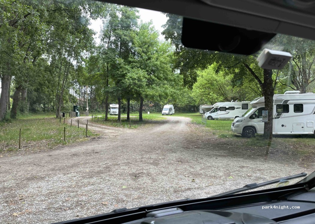 Parking pour camping-cars à côté de la ville et entouré d'arbres. Beau parc pour passer la nuit. Sympa.