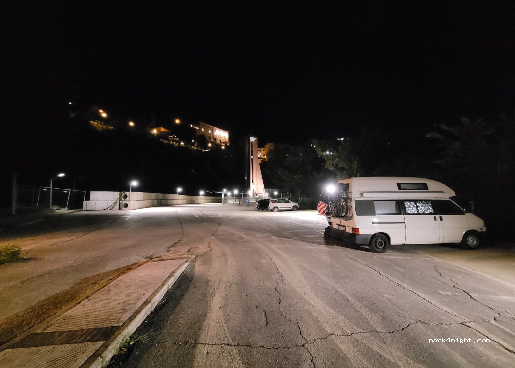 Kostenpflichtige Parkplätze und freie Plätze in der Nähe der Bushaltestelle, aber ziemlich voll. Im Sommer kleine Bar in der Nähe, also Musik bis Mitternacht. Ansonsten perfekter Ort in der Nähe der zu besuchenden Denkmäler und des Stadtzentrums. Wir haben die Nacht und den Tag dort verbracht.