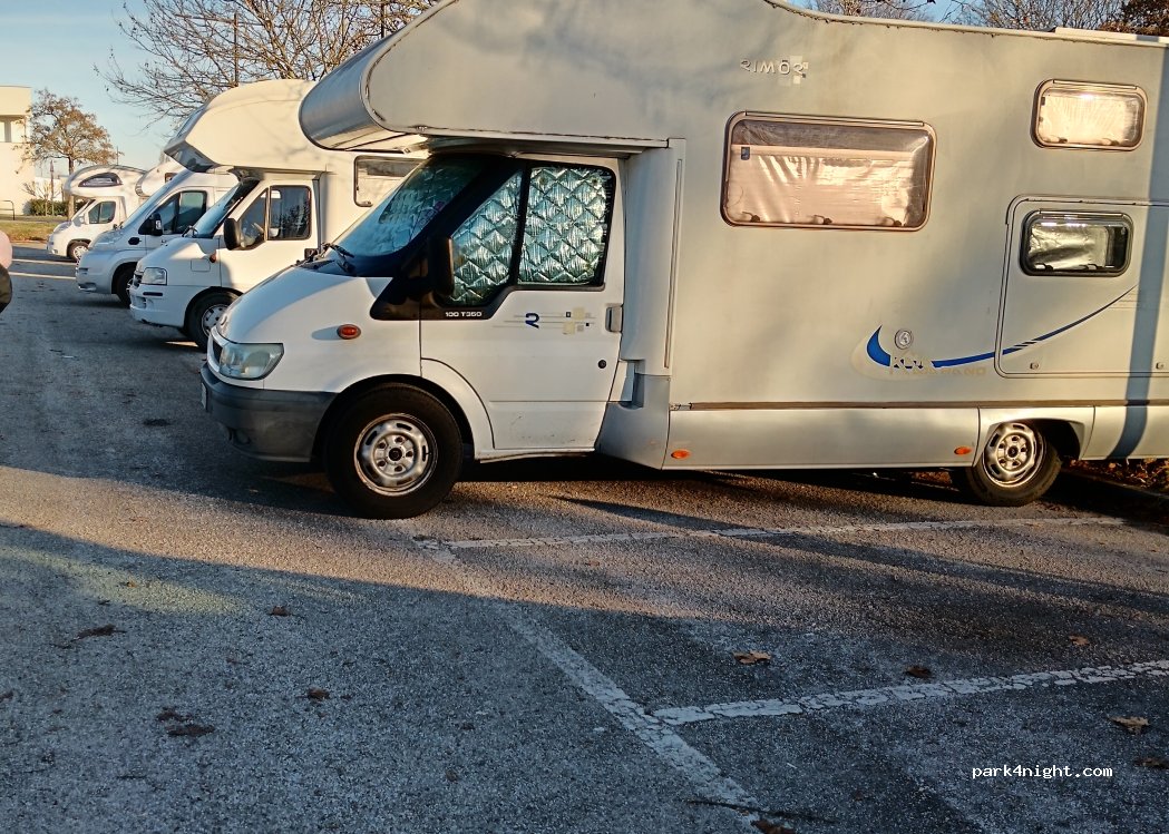 Grand parking, situé à côté d'un parc. À 20 minutes du centre historique. Possibilité de vider eaux usées et de remplir l'eau