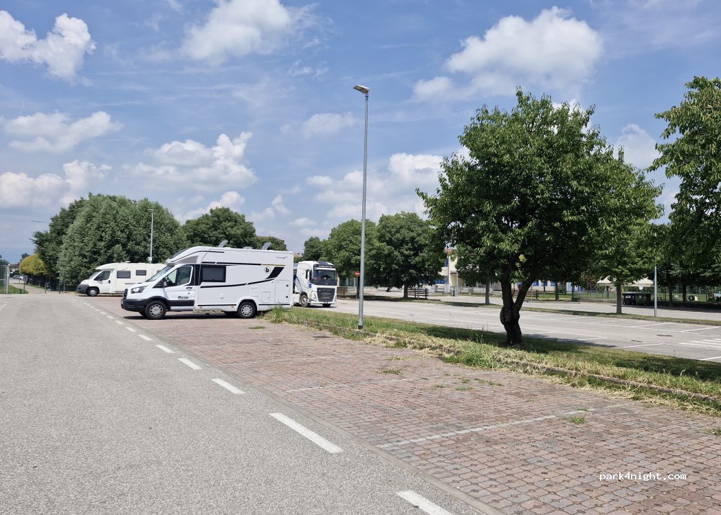 Un 2e parking un peu plus loin près des terrains de foot et tennis. Nuit calme hier, samedi. Très calme aussi ce matin. Jeux pour enfants. Laverie ouverte le dimanche, commerces et restaurants à 5mins à pied. idéale pour une nuit ! Merci à la commune de Gazzo !