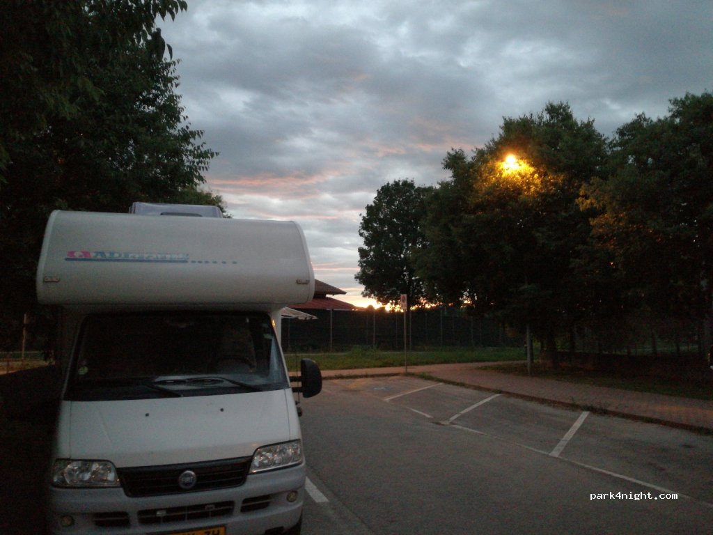 Spacious parking lot at sports complex. Peaceful overnight stay. Locals take a walk there. Village center at 250 m.