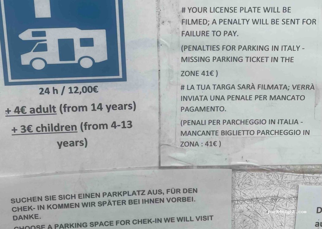 Area sosta com vagas delimitadas, iluminada,segura ônibus para Santa Maddalena a 100m €4 por pessoa. Preço da diaria camper para 2 pessoas €30 , serviços €5, a eletrecidade tbm a parte. É uma boa opção quando a área de Santa Maddalena está cheia, caso tenha vagas fique la, pois sai pelo mesmo preço , os serviços são inclusos e vc não precisa pegar ônibus
