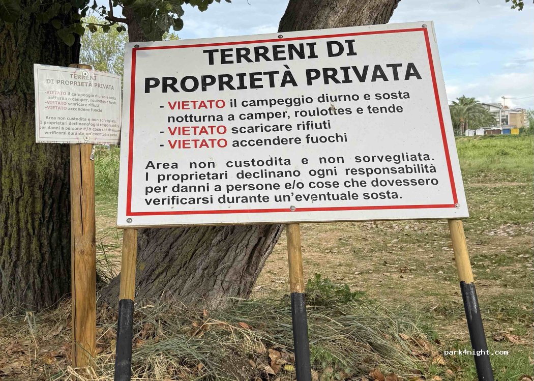 Bellissimo Parcheggio, tranquillo, con zone in ombra, davanti ad una spiaggia libera. In caso di veicolo alto passare da via Emilia. Okkio ci sono dei cartelli di divieto per la sosta notturna, ma non è passato nessuno.