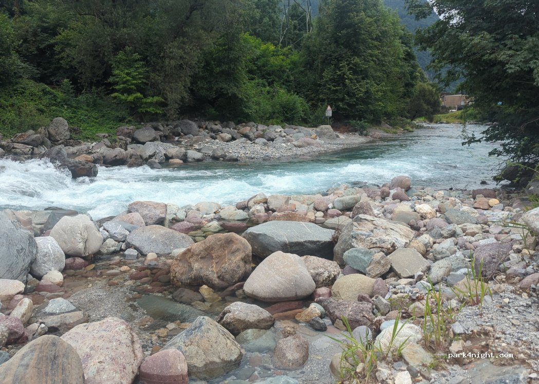en contrebas de la route. donc plutôt silencieux. et accès direct au ruisseau. très sympa surtout quand on aime le bruit blanc de l'eau !