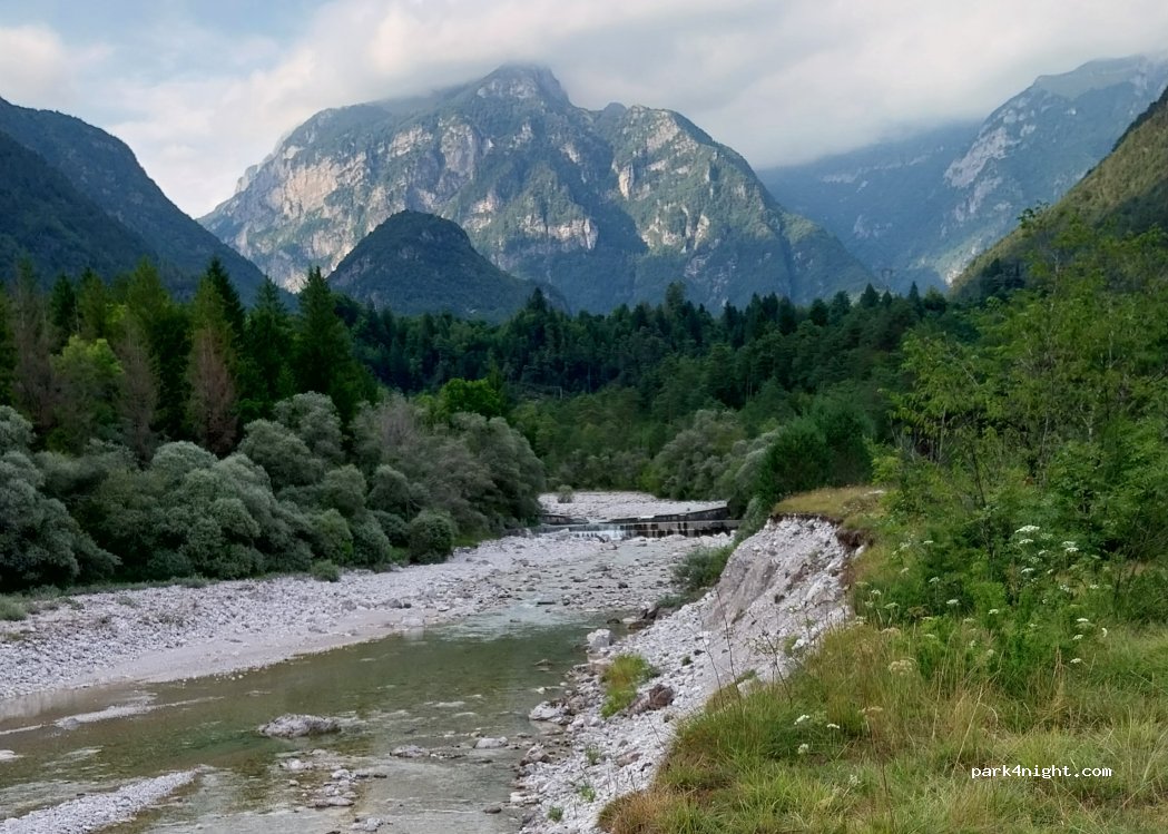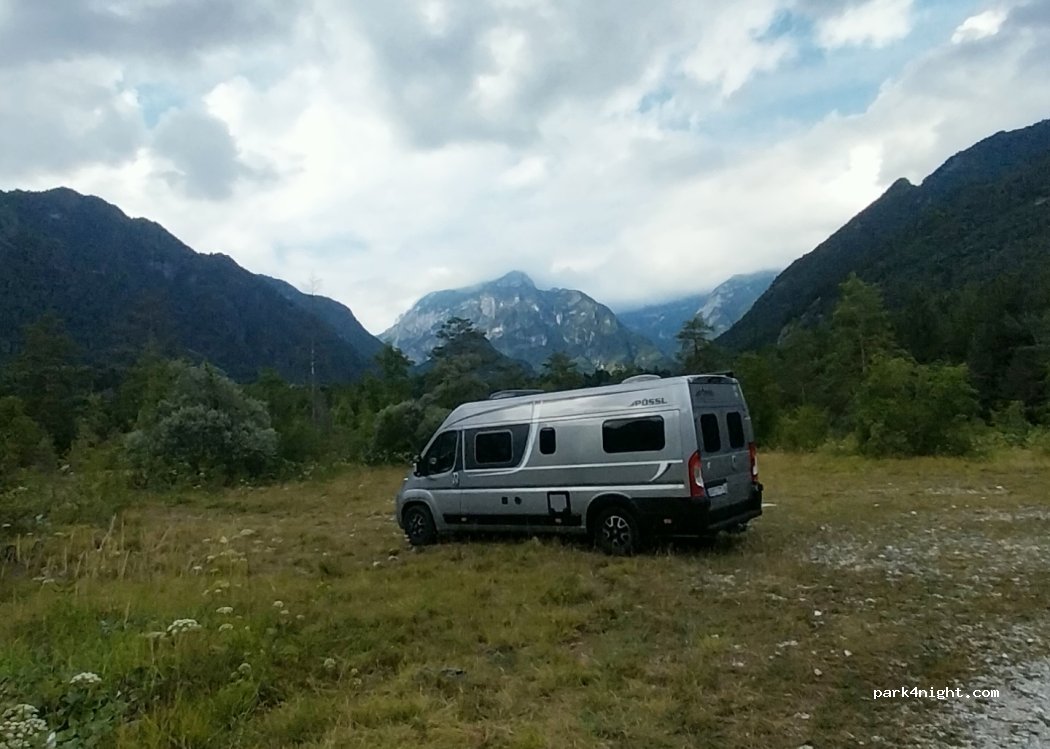 Space for 5-6 vehicles. Above the Triamonte River. Fireplaces available. Very quiet, nice view. Follow the sign "Picnic" on the road through the forest. We stood alone for one night.