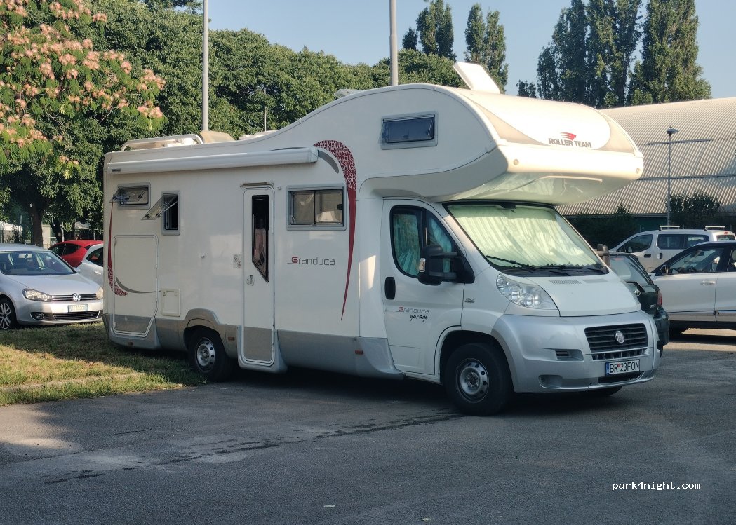 A great stop with trees shade & a lovely green area. There is a tram stop nearby to take you into Rimini, but we walked it40 mins 15mins walk to the beach.fenced in dog park nearby with free water from a tap only. we only stayed over 1 night, planned to stay over for 2 nights but police came round & said that there were too many campers here & we had to move on by half hour or we would get a fine