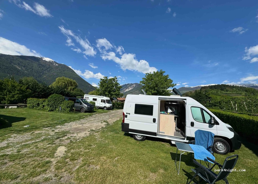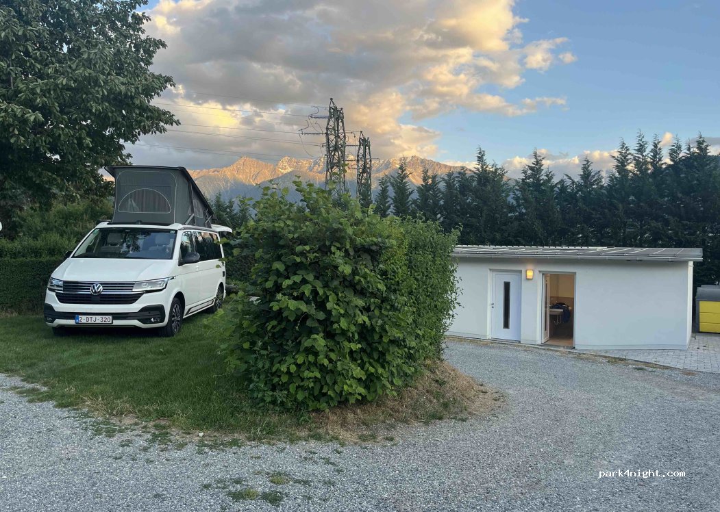 Parcela sencilla para pasar la noche junto al camping habitual con instalaciones sanitarias propias (duchas gratuitas y de pago por 2 €) y parcelas de césped de aproximadamente 8 x 5 m cada una. Electricidad disponible. En el edificio del camping hay restaurante, bar y mini mercado.