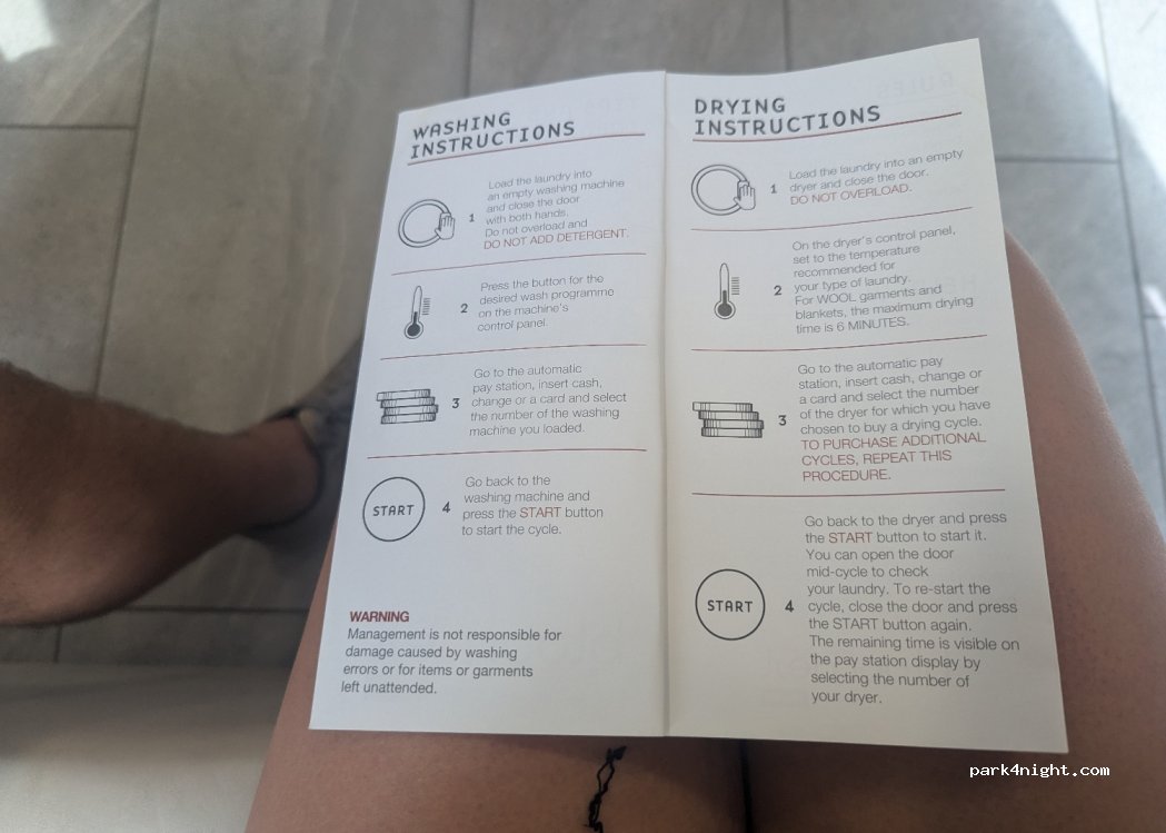 Alles sauber und auf guten technischen Zustand. Täglich wird morgens gereinigt. Man kann mit Münzgeld oder Scheinen bezahlen. Oder wenn man hat, mit einer Kundenkarte. Den Trockner kann man öffnen, während der Laufzeit um Dinge nachzulegen oder rauszunehmen. Danach einfach wieder auf Start drücken.