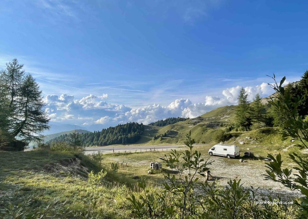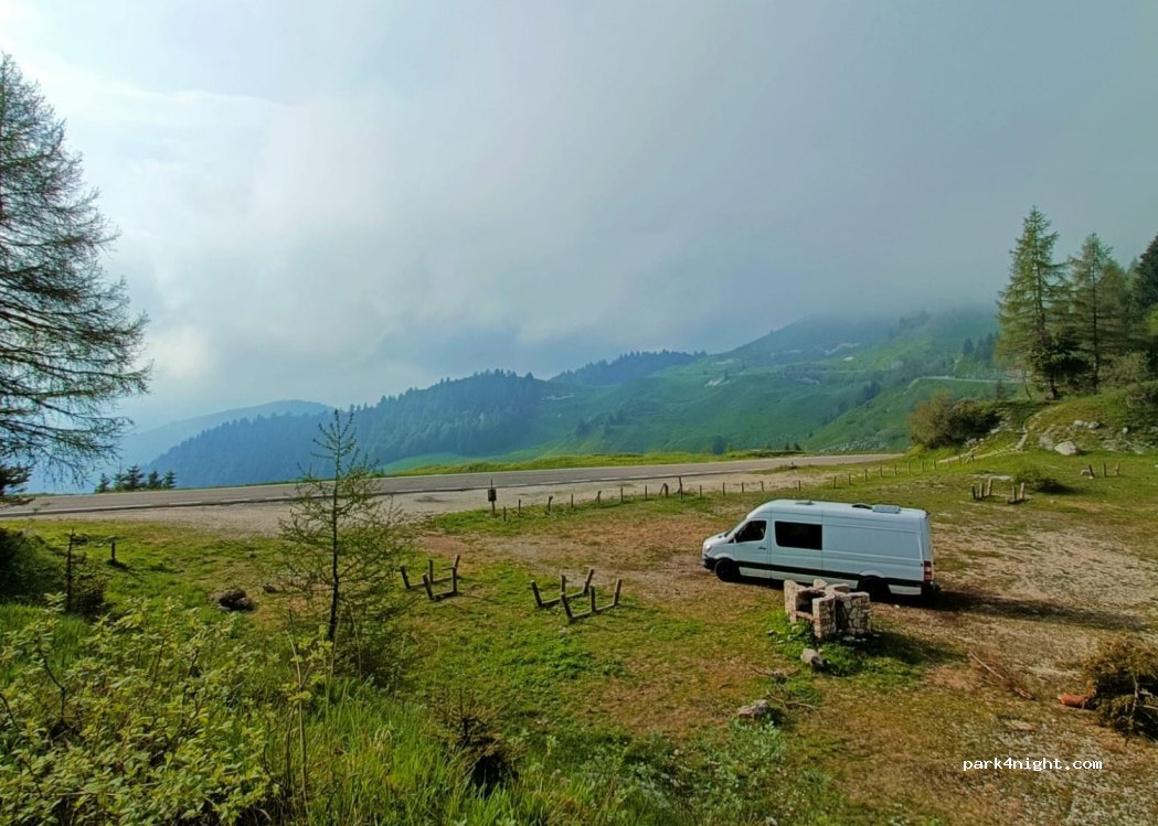 Parking d'une ancienne aire de pique-nique (bancs et tables cassés). Face au Refugio Scarpon. Point de départ de randonnées pédestres et cyclistes. Le monument de Monte Grappa est juste au-dessus. Peu de circulation et donc calme.