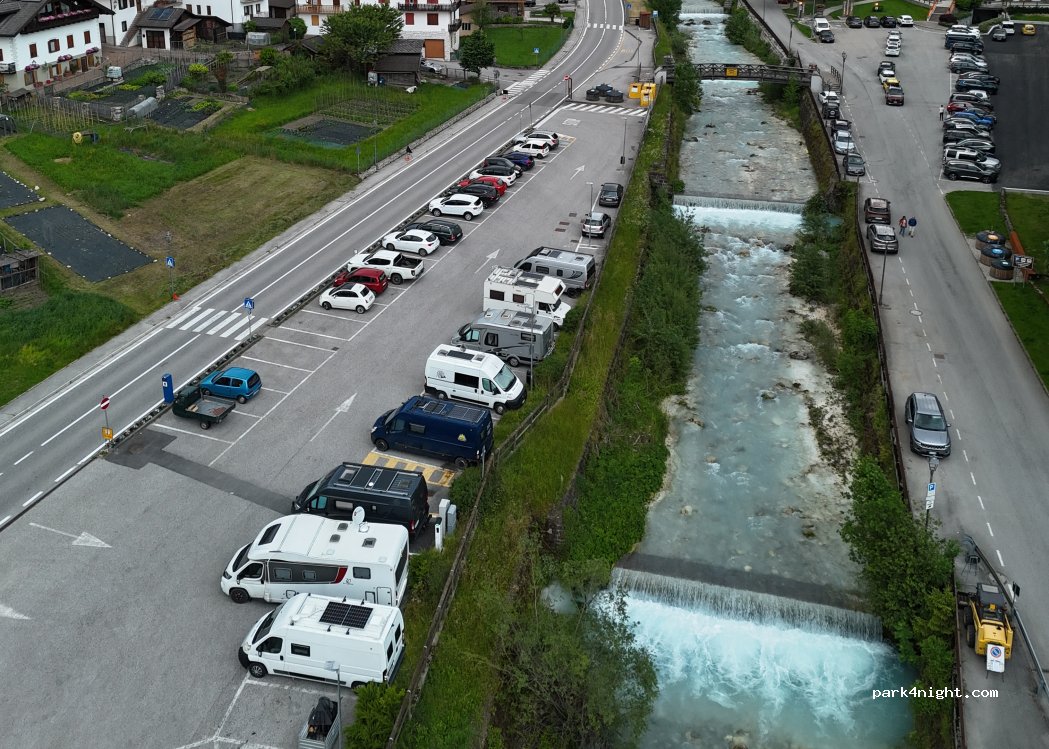 Grand parking gratuit pour une halte d'une nuit. Peu de places, peut-être5, pour des véhicules de 7 m. Très proche du centre de Primiero. Il y a des restaurants et des pizzerias à 50m. très éclairé et proche d'un ruisseau, qui fait office de fond.