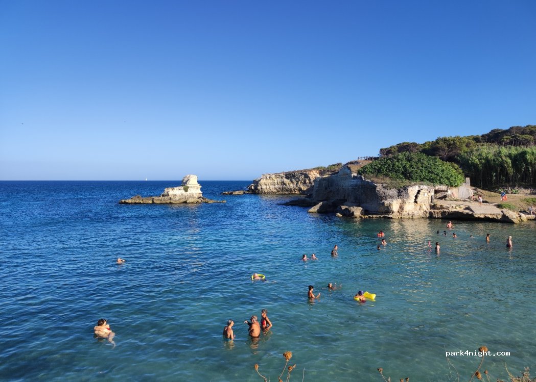 area camper a torre sant'andrea con posti all'ombra. il mare dista 10 minuti a piedi oppure c'è il bus navetta verso torre dell'orso docce a pagamento. in agosto 35€ a notte tassa soggiorno a persona. in zona, supermercato e macelleria a 10 min a piedi, oppure piccolo negozio interno di frutta e verdura, pane e vino.