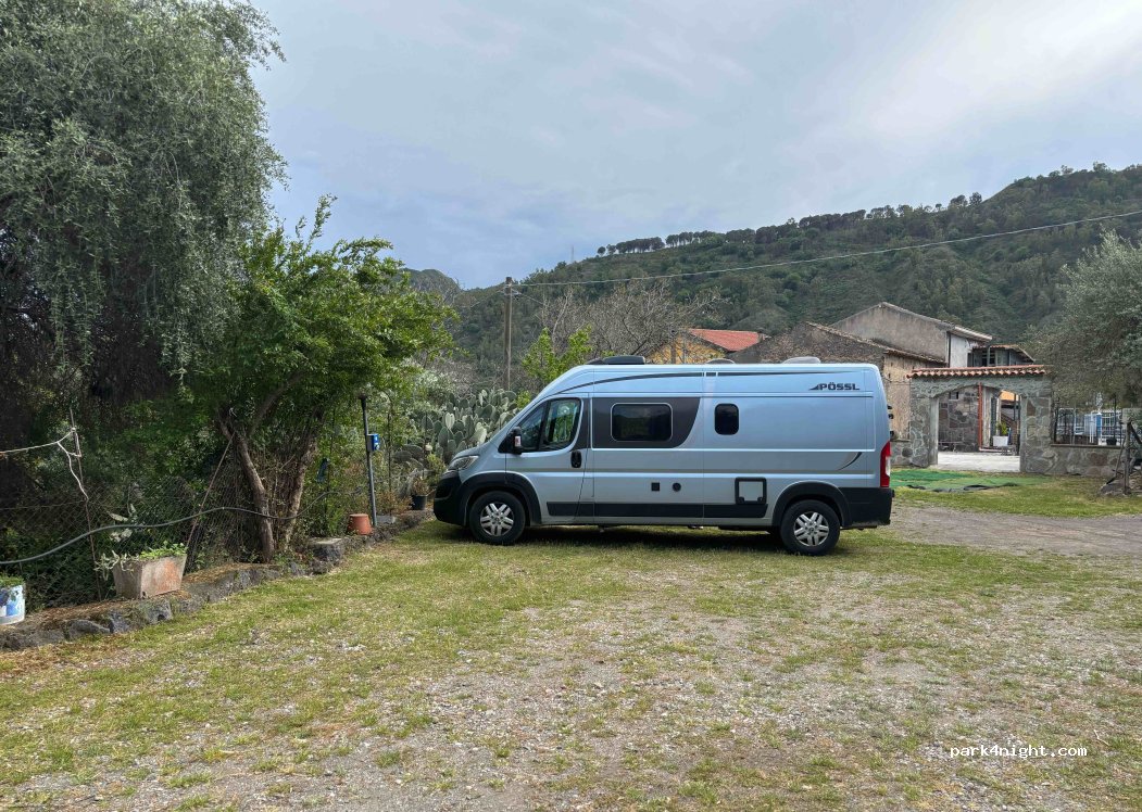 Petite aire avec électricité et eau. Nous avons payé en hors saison 10€ pour la nuit. Le parc d'activité est juste en face. Beau jardin botanique avec de belles gorges (Gole dell Alcantara) et des activités body rafting et balade sur l'Etna. Une nuit au calme peu de circulation. vendent de l'huile et du vin