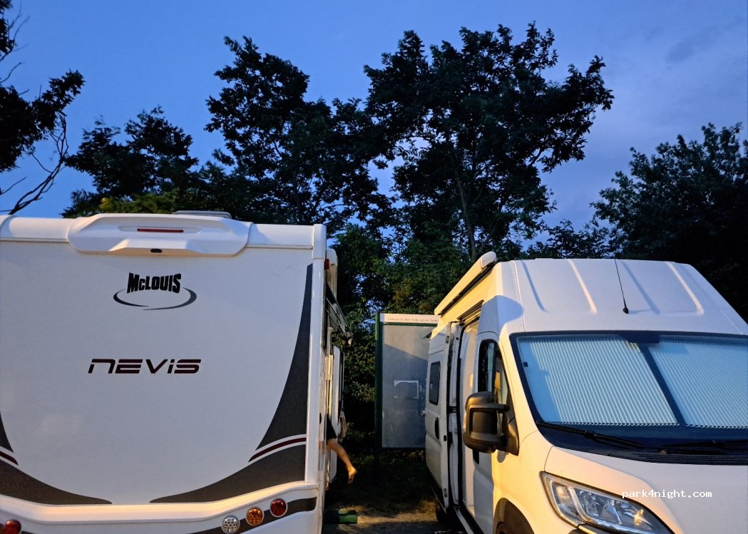 très belle nuit passée sur ce parking, avec vue direct sur l abbaye Poubelles a proximité non accessibles (verrou) Point d eau récupérable que par bidon Avec notre fille de 10 ans nous sommes montés en 25 minutes