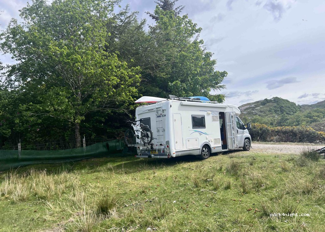 Spot for about 3-5 camper vans, levelled, quiet place, gated road continues through the forest leading to Singing Sands beach about an hour walk away, at night you end up here alone with sheep, great place to stay overnight, no signs you can’t do so