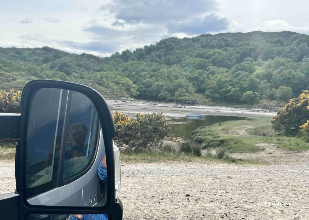Platz für ca. 3-5 Wohnmobile, ebener, ruhiger Ort, bewachte Straße führt weiter durch den Wald zum etwa eine Stunde entfernten Strand von Singing Sands, nachts landet man hier allein mit Schafen, toller Ort zum Übernachten, keine Schilder kann das nicht