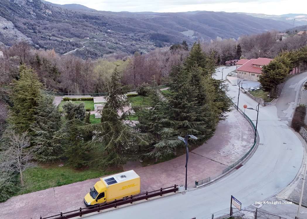 Parking on a slight slope adjacent to the municipal park. A short distance from the historic center (5 mins), from the Tibetan bridge (10 mins) and from restaurants, pizzerias, grocery stores. Possibility of quadbike excursions with the shop in front (it is he who advised me to put myself here). For now, since there is no real area / parking for campers, the municipality allows you to stop here.