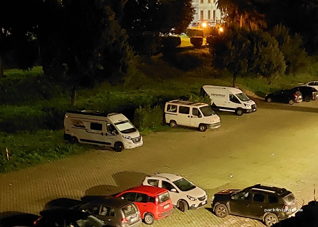 Abbiamo parcheggiato il sabato sera verso le 19,00 c'erano ancora tanti posti poi arrivano le vetture, consiglio di arrivare per tempo. Accesso un po' stretto ma fattibile con camper 720cm, poi ampio per qualsiasi mezzo. Comodo per il centro di Grosseto. Siamo stati a cena e poi abbiamo pernottato. C'erano altri camper. Non abbiamo avuto problemi di sicurezza, anche la notte è stata tranquilla.