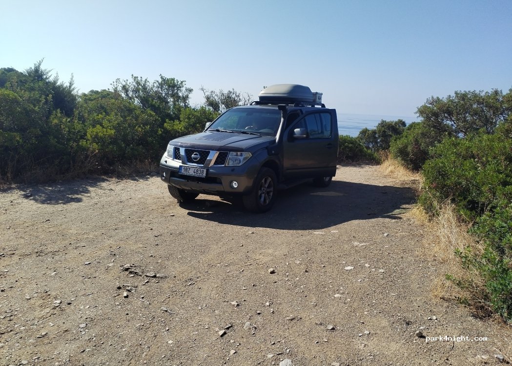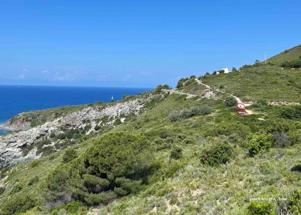 Fünf Parkplätze stehen zur Verfügung: vier mit teilweisem Meerblick und einer im Schatten, aber ohne Aussicht. Es gibt keine Serviceeinrichtungen vor Ort.