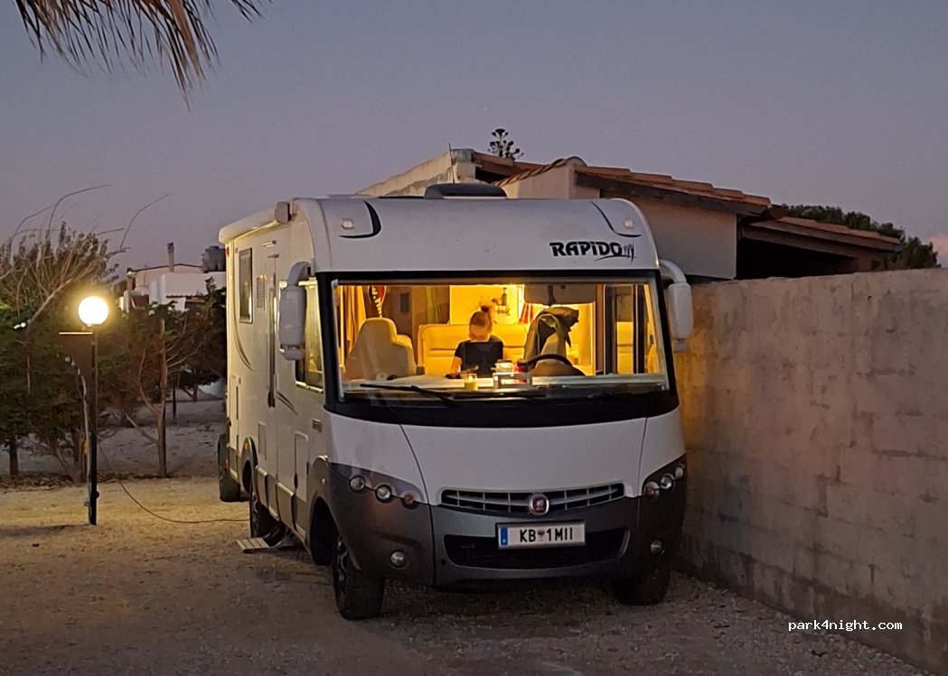 Cordiale accoglienza, posto tranquillo e pulito che si affaccia su una spiaggia di sabbia. Purtroppo non ci sono alberi e il caldo può farsi sentire sul camper. Di solito c’è vento e fuori si sta bene. Ci sono solo un bagno per uomo ed uno per donna e un po’ di docce, tutto senza soffitto. Consigliabile per qualche giorno di mare. Si paga 30euro al giorno di 24h.