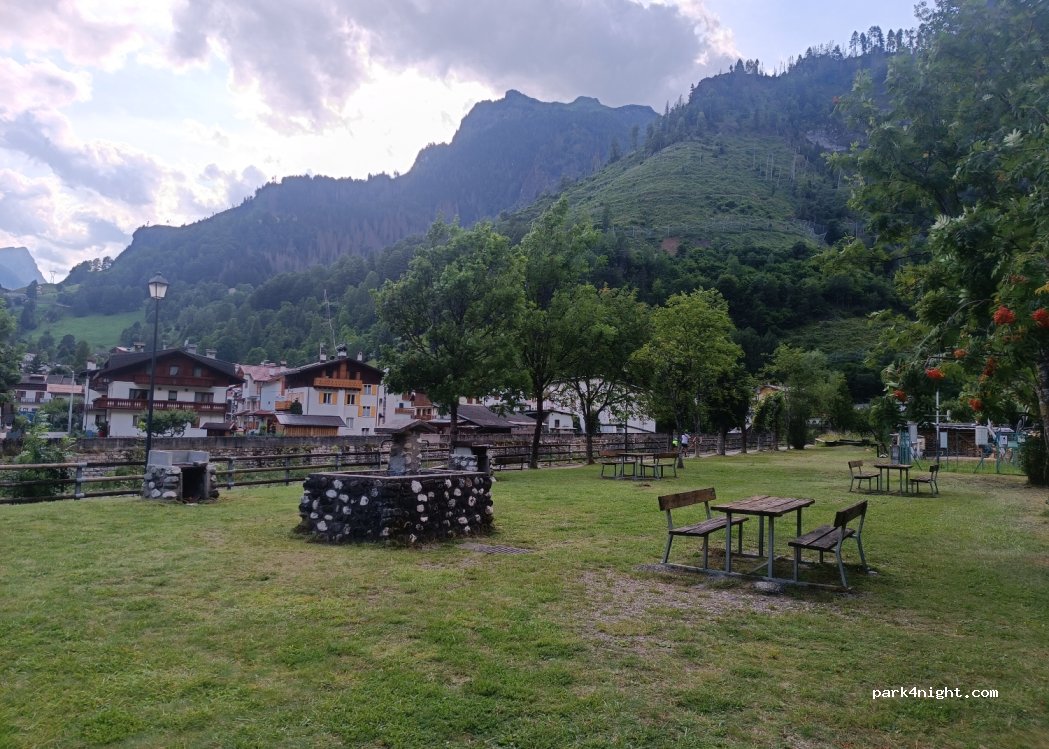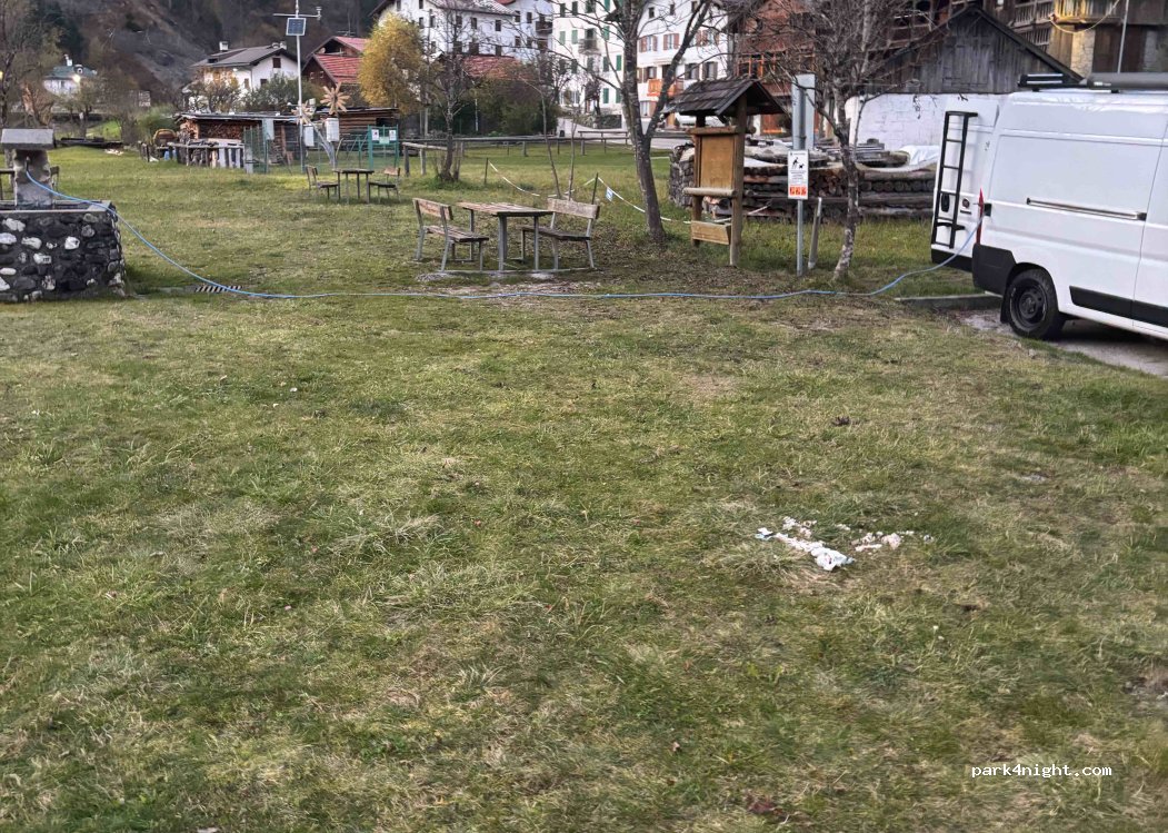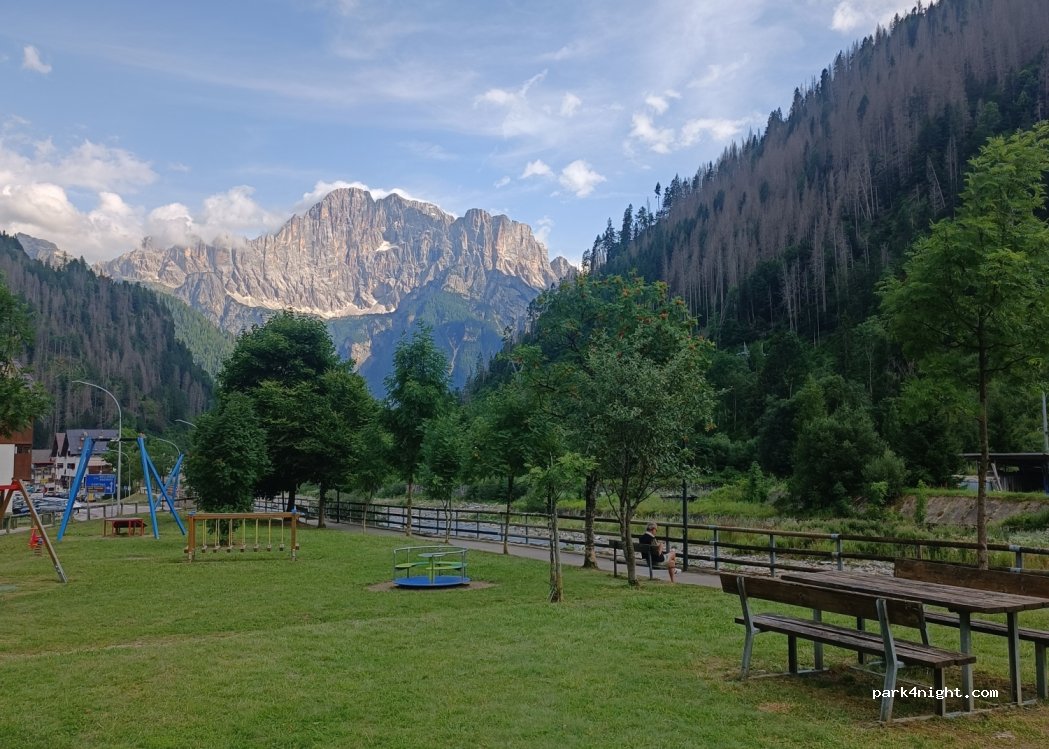Piccolo parcheggio molto tranquillo, a fianco di una bella area picnic, con tavoli, barbecue, fontanella e parco giochi. Sulla pista ciclabile che porta ad Alleghe.