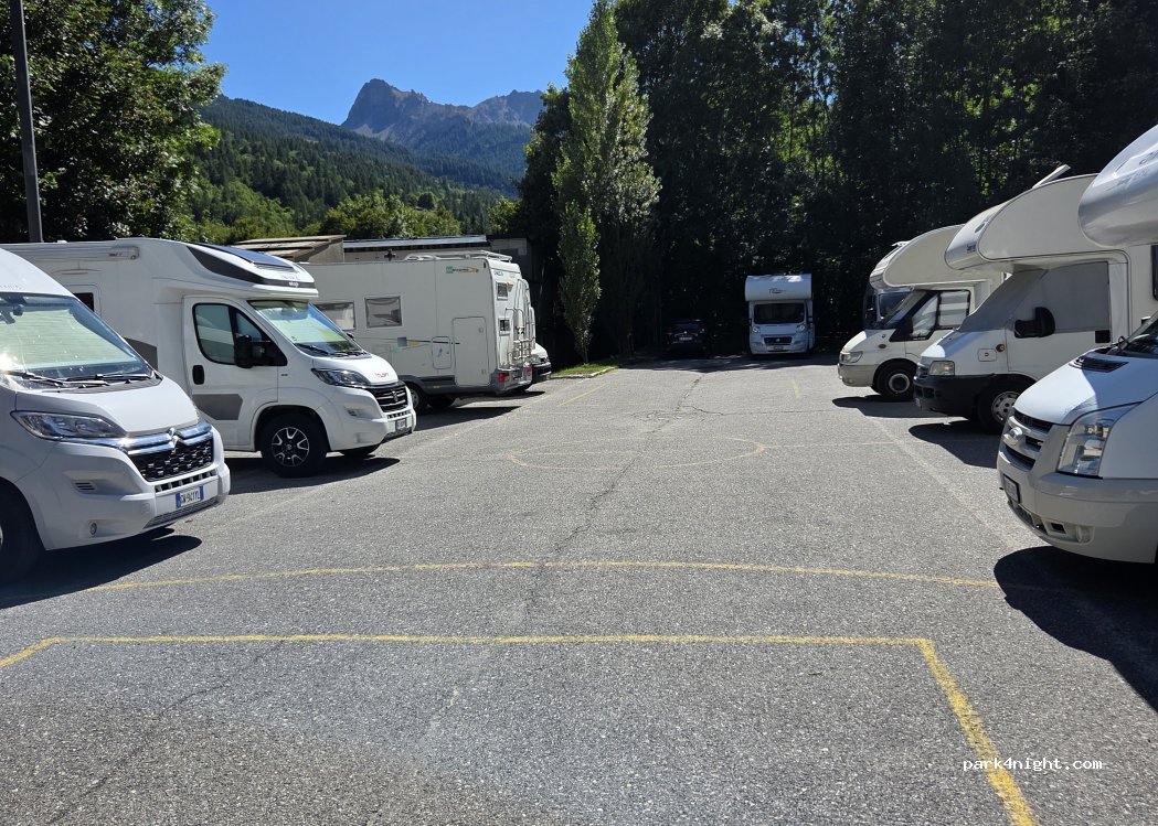 Parcheggio pubblico tra il cimitero e la centrale idroelettrica. Molto tranquillo, asfaltato, pianeggiante e libero ai camper. Con un po' di fortuna con un camper mansardato si riesce a parcheggiare con il posteriore a sbalzo sul verde, senza eccedere lo spazio delimitato per le auto.