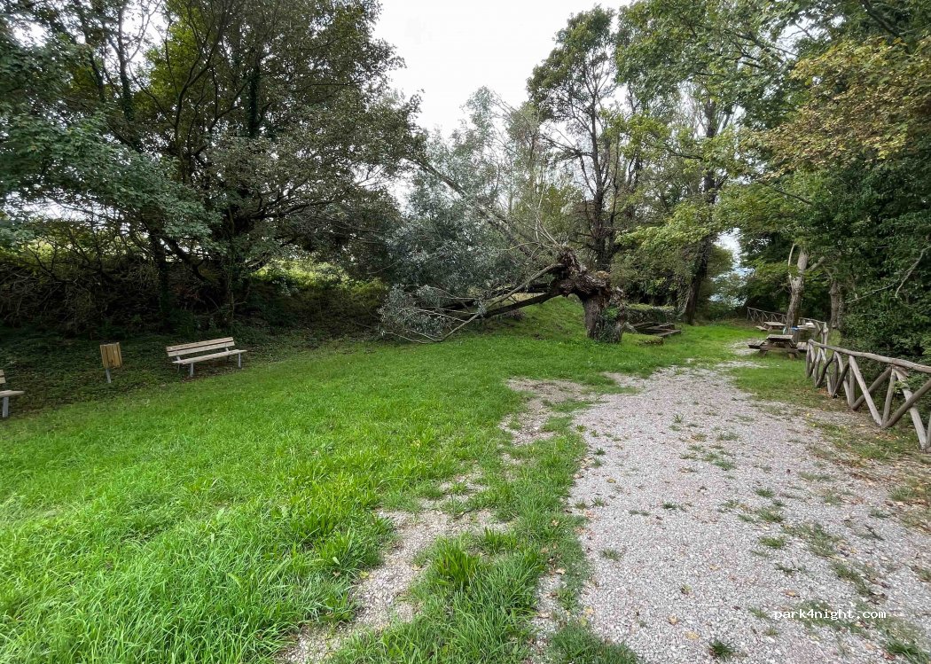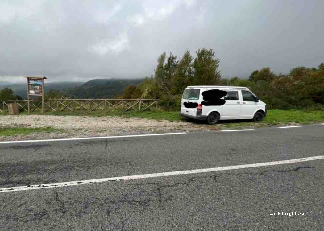 Area picnic sotto gli alberi sotto la strada con pochi tavoli. Una sorgente d'acqua vicino al luogo, ideale per fare rifornimento. 2-3 posizioni. Tranquillo per passare la notte. Accesso con discesa sterrata abbastanza ripida.