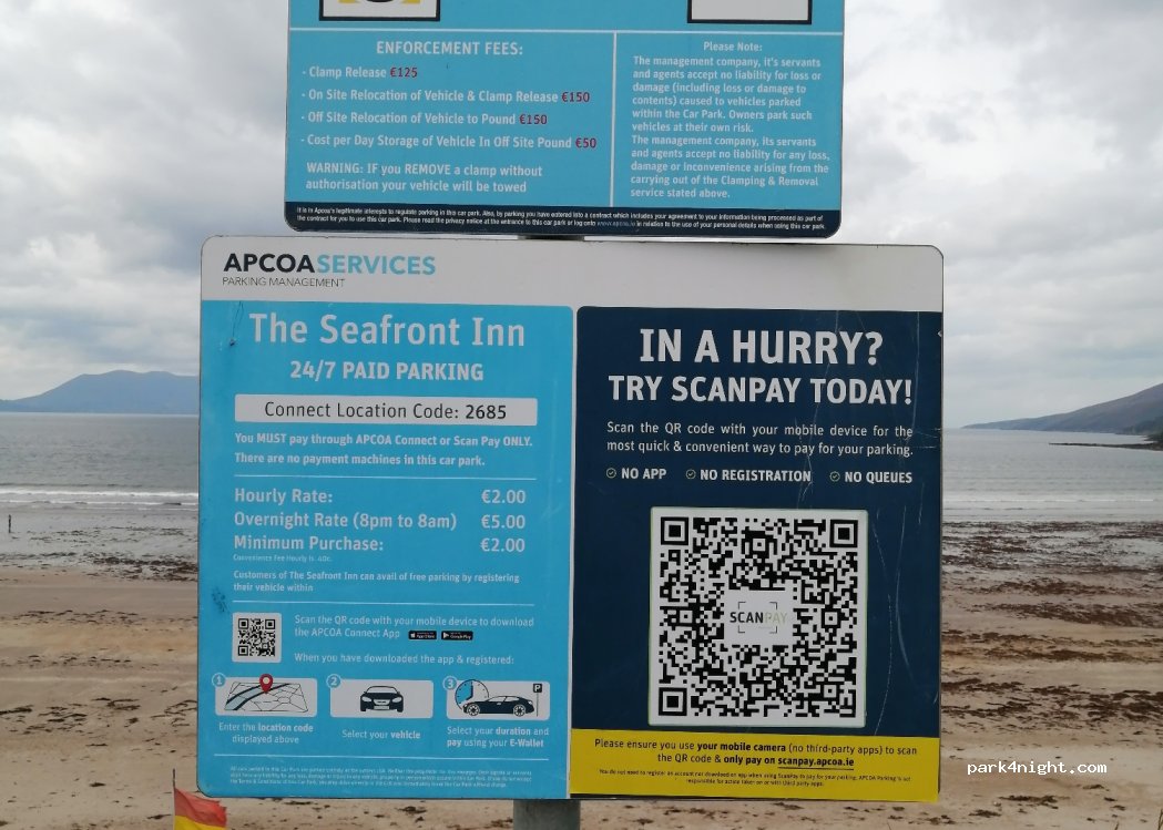 Can’t park on the beach overnight (is definitely patrolled) but roadside car park up hill is paid parking 24 hours through app. Pay using QR code on sign. 6 euros overnight and 1 euro an hour - we paid 11 total. Absolutely incredible views of the Atlantic and Kerry Mountains. Road not too loud, worth it for the view.