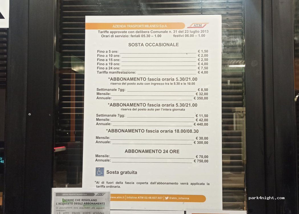 Voordelige parkeerplaats direct naast het bus/tram/metrostation. Zonder toezicht, maar beschermd door een hoog hek. De parkeerplaats wordt door de verkeerspolitie van Milaan gebruikt als parkeerplaats voor getrokken voertuigen.